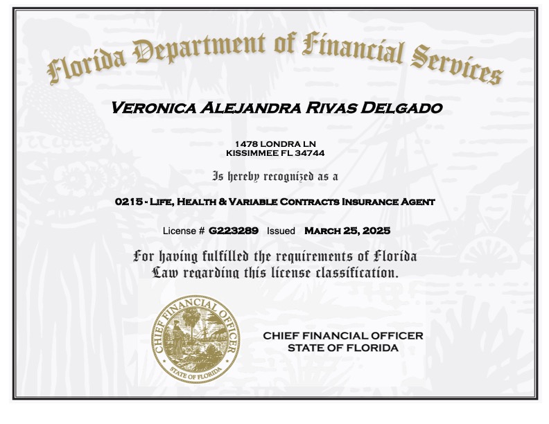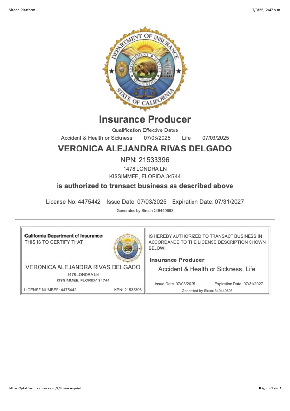 Soy un agente de seguros licenciado en más de 10 estados de los Estados Unidos, cumpliendo con todos los requisitos y regulaciones tanto a nivel estatal como federal.